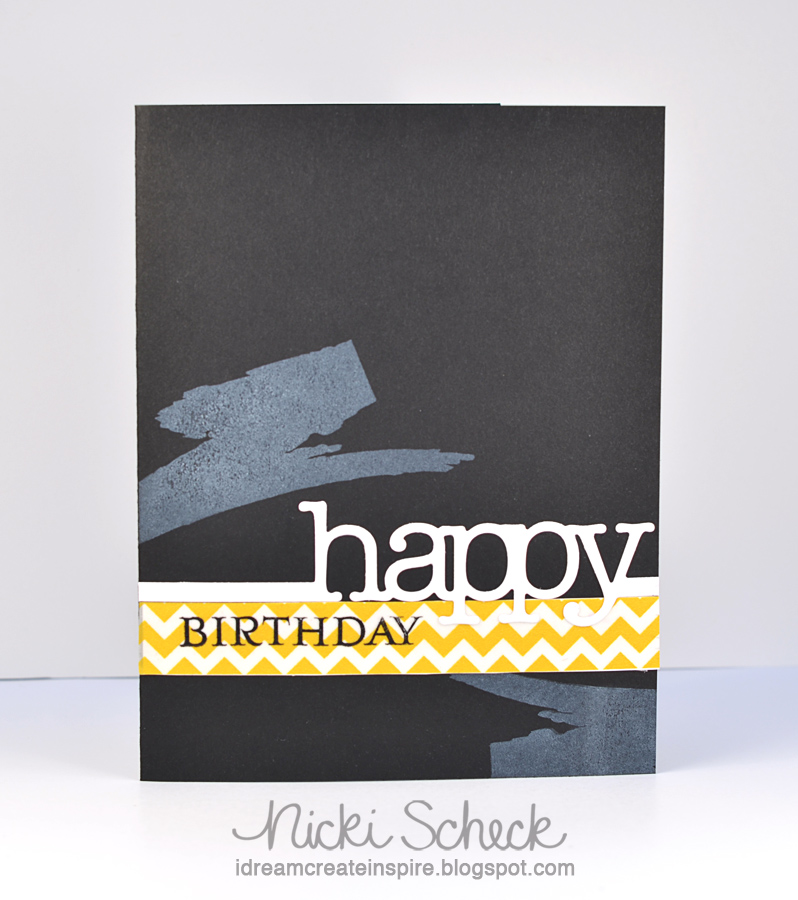 Hello! Poppin' in real quick to share a masculine birthday card I made for my BIL. I'm really diggin' this!! I rarely use a black card base, but LOVE the contrast of the white and yellow with it! The yellow chevron is washi tape, BTW!